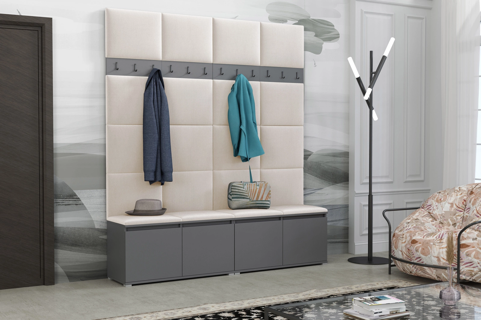 - Tapicerowana garderoba o szerokości 200 cm z miękkimi panelami kuframi na buty i wieszakami. Idealna do dużego przedpokoju – porządek, komfort i elegancja. Chroni ścianę, ułatwia organizację i świetnie wpisuje się w nowoczesne wnętrza.