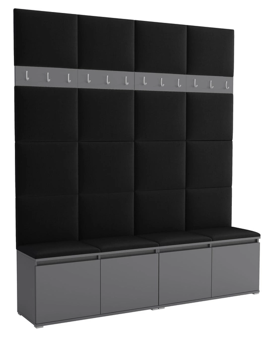 - Tapicerowana garderoba o szerokości 200 cm z miękkimi panelami kuframi na buty i wieszakami. Idealna do dużego przedpokoju – porządek, komfort i elegancja. Chroni ścianę, ułatwia organizację i świetnie wpisuje się w nowoczesne wnętrza.
