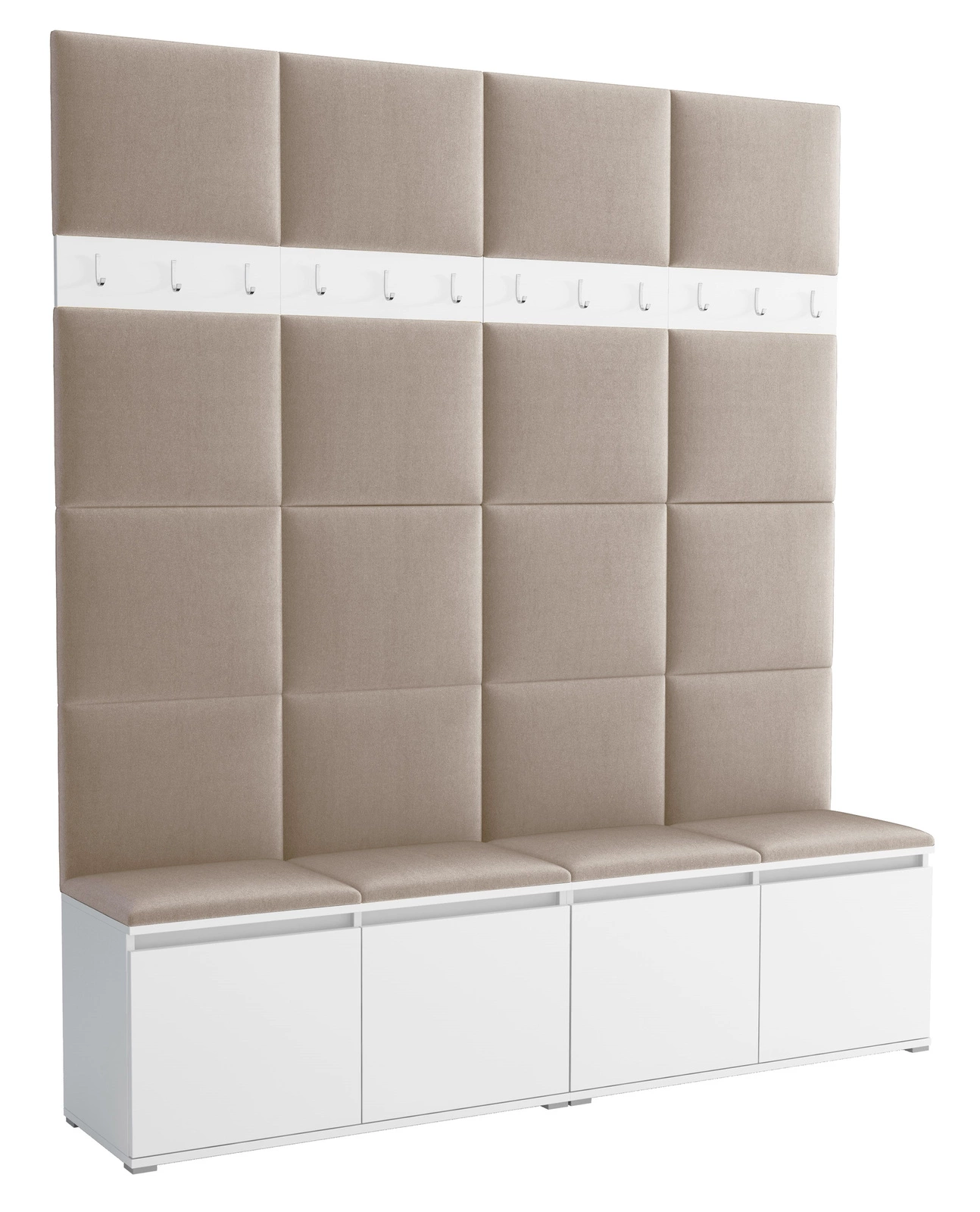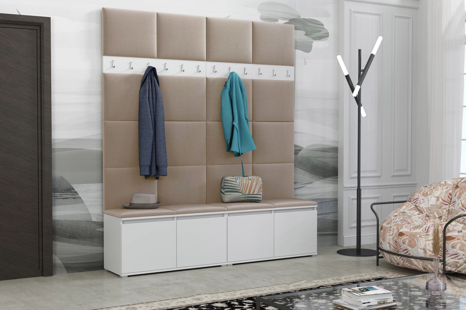 - Tapicerowana garderoba o szerokości 200 cm z miękkimi panelami kuframi na buty i wieszakami. Idealna do dużego przedpokoju – porządek, komfort i elegancja. Chroni ścianę, ułatwia organizację i świetnie wpisuje się w nowoczesne wnętrza.
