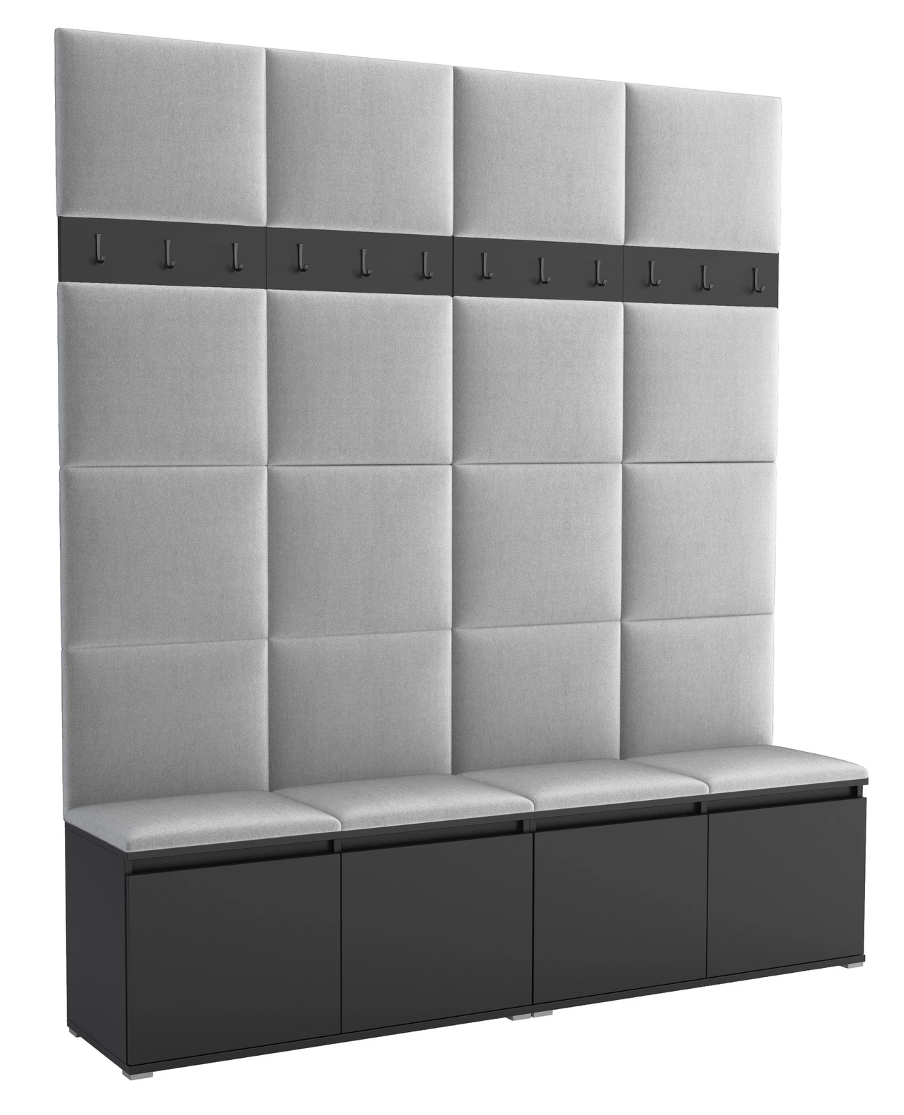 - Tapicerowana garderoba o szerokości 200 cm z miękkimi panelami kuframi na buty i wieszakami. Idealna do dużego przedpokoju – porządek, komfort i elegancja. Chroni ścianę, ułatwia organizację i świetnie wpisuje się w nowoczesne wnętrza.