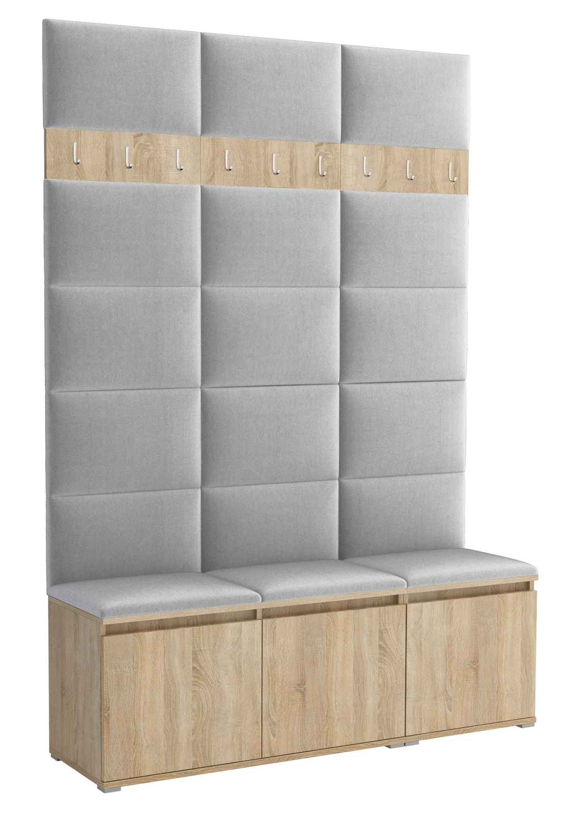 - Tapicerowana garderoba o szerokości 150 cm z miękkimi panelami kuframi na buty i wieszakami. Idealna do średniego przedpokoju – porządek, komfort i elegancja. Chroni ścianę, ułatwia organizację i świetnie wpisuje się w nowoczesne wnętrza.