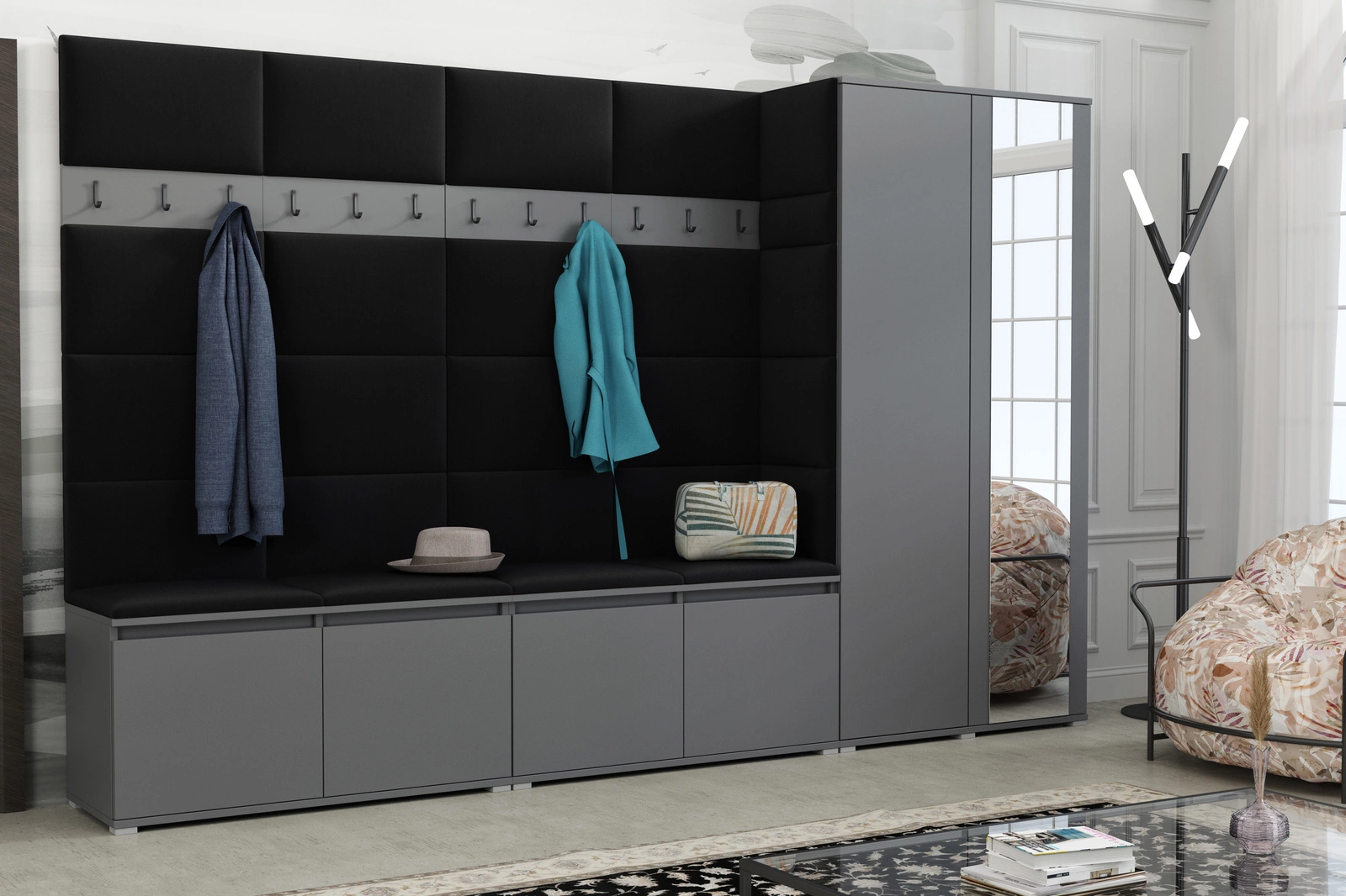 • Tapicerowana garderoba o szerokości 290 cm z miękkimi panelami kuframi na buty, wieszakami i pojemną szafą. Idealna do dużego przedpokoju – porządek, komfort i elegancja. Chroni ścianę, ułatwia organizację i świetnie wpisuje się w nowoczesne wnętrza.