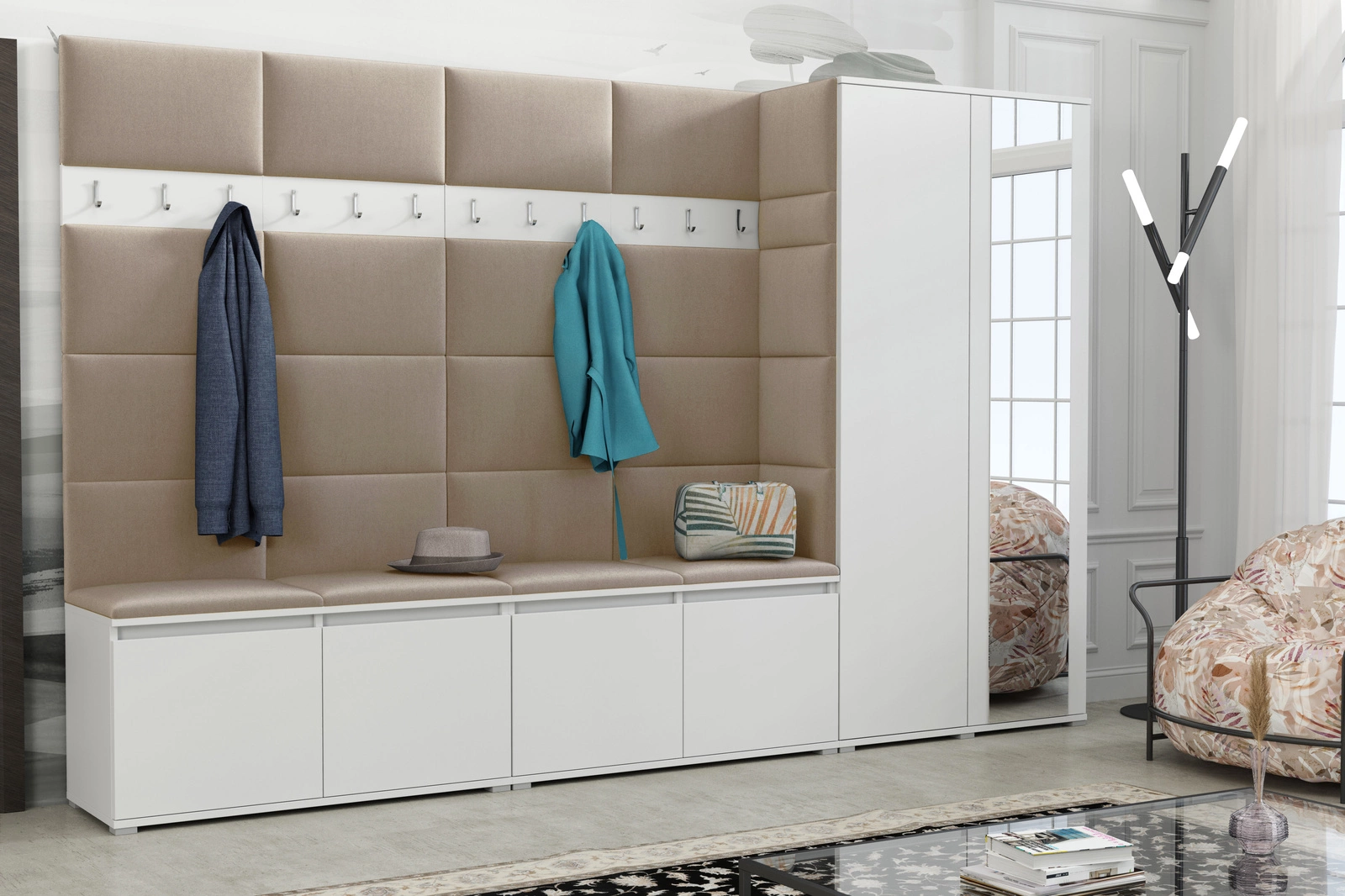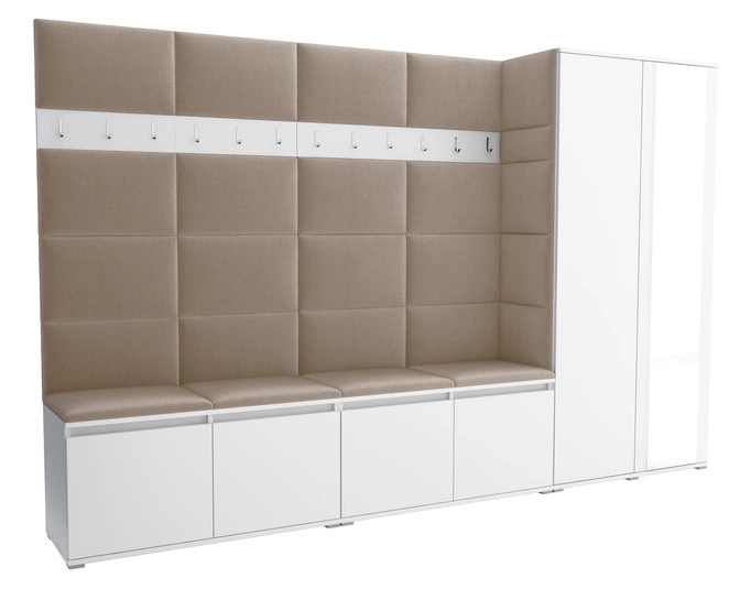 Zestaw składa się z tapicerowanych paneli ściennych, które dodają wnętrzu przytulności i stylu, a także chronią ściany przed zabrudzeniami. Znajdziesz tu rząd solidnych wieszaków, które pomieszczą okrycia wierzchnie całej rodziny, a do tego pojemną szafę z lustrem, która wizualnie powiększa przestrzeń i pozwala szybko sprawdzić swój wygląd przed wyjściem z domu.