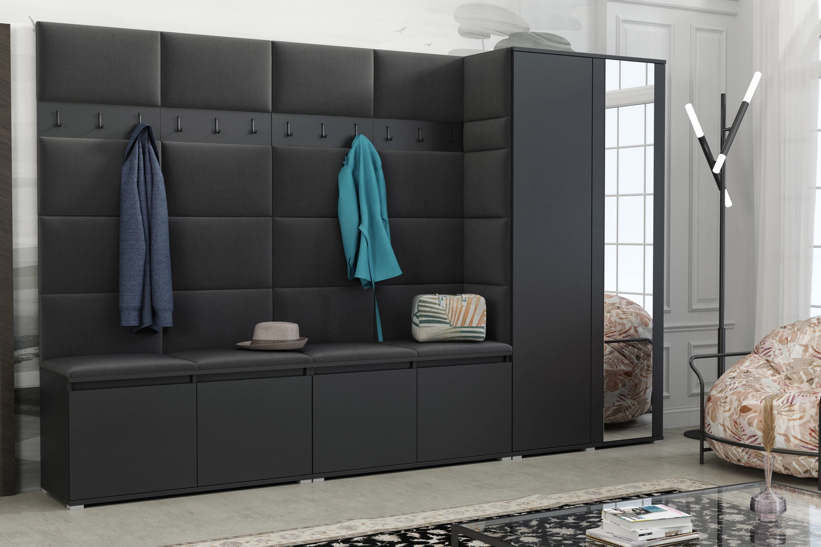 - Tapicerowana garderoba o szerokości 290 cm z miękkimi panelami kuframi na buty, wieszakami i pojemną szafą. Idealna do dużego przedpokoju – porządek, komfort i elegancja. Chroni ścianę, ułatwia organizację i świetnie wpisuje się w nowoczesne wnętrza.