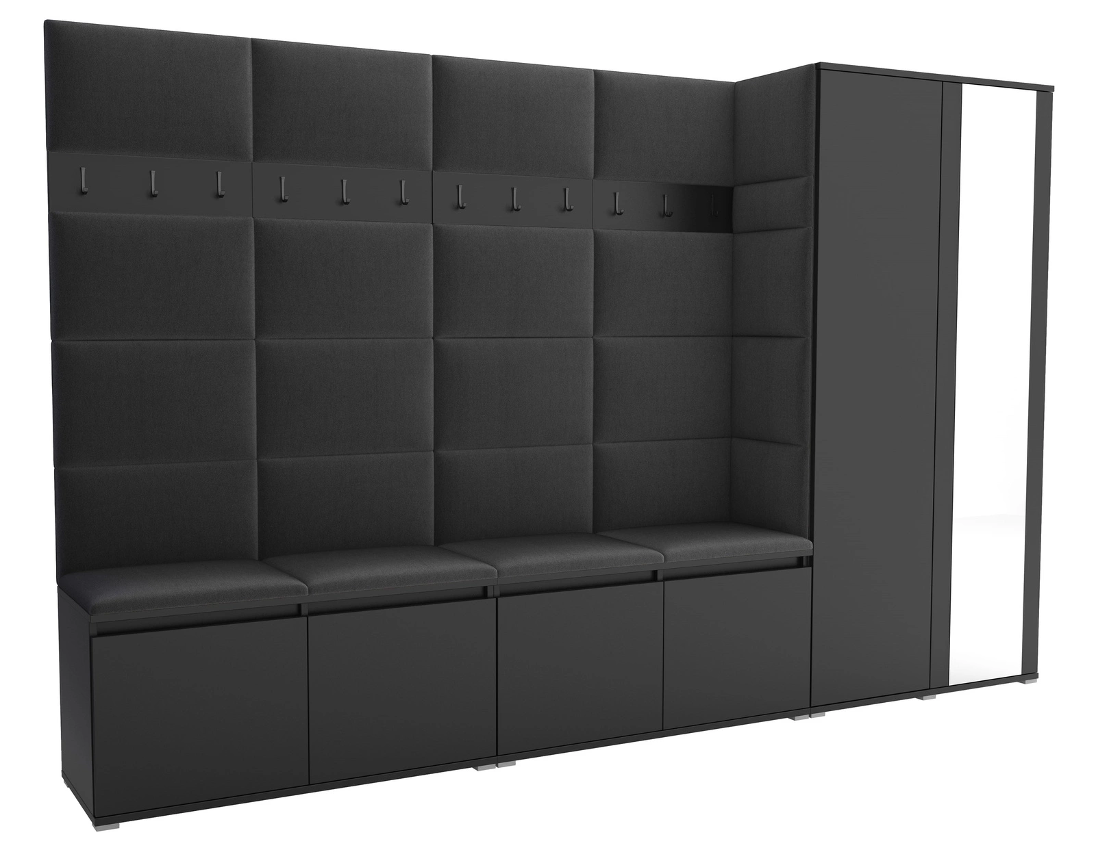 Zestaw składa się z tapicerowanych paneli ściennych, które dodają wnętrzu przytulności i stylu, a także chronią ściany przed zabrudzeniami. Znajdziesz tu rząd solidnych wieszaków, które pomieszczą okrycia wierzchnie całej rodziny, a do tego pojemną szafę z lustrem, która wizualnie powiększa przestrzeń i pozwala szybko sprawdzić swój wygląd przed wyjściem z domu.