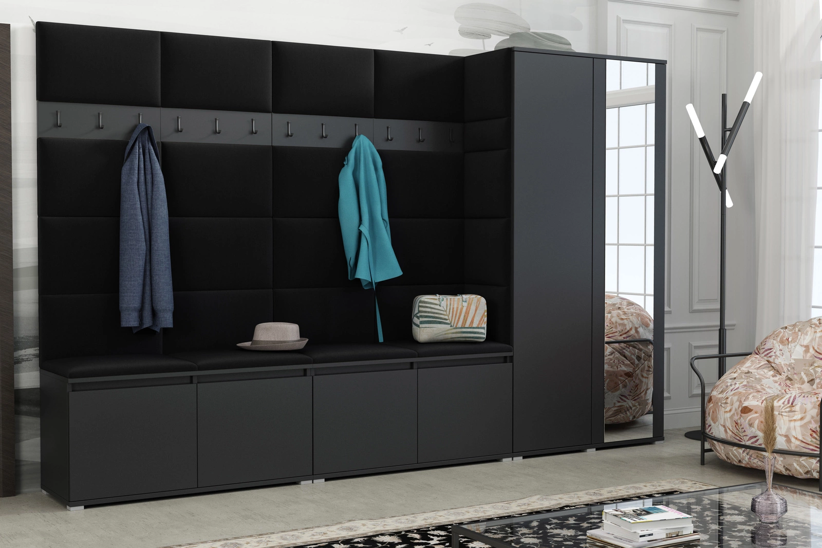 Zestaw składa się z tapicerowanych paneli ściennych, które dodają wnętrzu przytulności i stylu, a także chronią ściany przed zabrudzeniami. Znajdziesz tu rząd solidnych wieszaków, które pomieszczą okrycia wierzchnie całej rodziny, a do tego pojemną szafę z lustrem, która wizualnie powiększa przestrzeń i pozwala szybko sprawdzić swój wygląd przed wyjściem z domu.