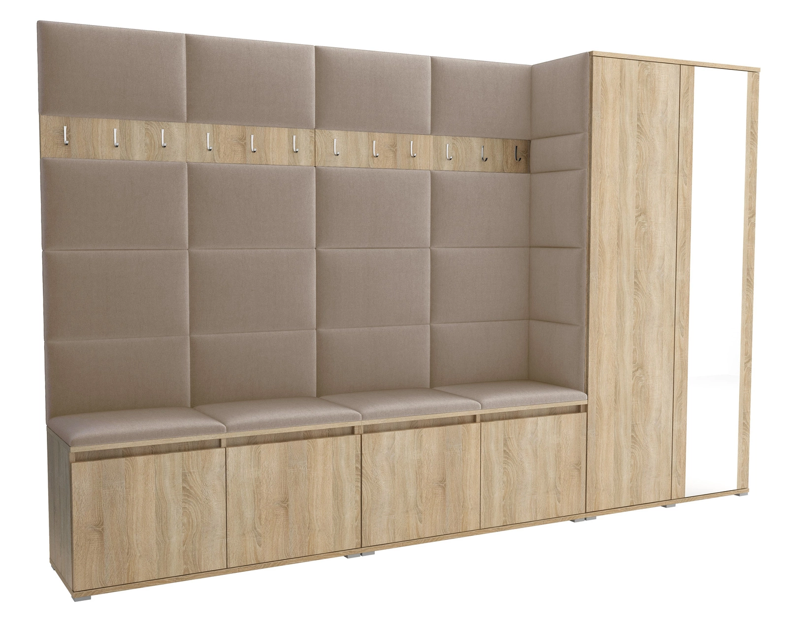 Zestaw składa się z tapicerowanych paneli ściennych, które dodają wnętrzu przytulności i stylu, a także chronią ściany przed zabrudzeniami. Znajdziesz tu rząd solidnych wieszaków, które pomieszczą okrycia wierzchnie całej rodziny, a do tego pojemną szafę z lustrem, która wizualnie powiększa przestrzeń i pozwala szybko sprawdzić swój wygląd przed wyjściem z domu.