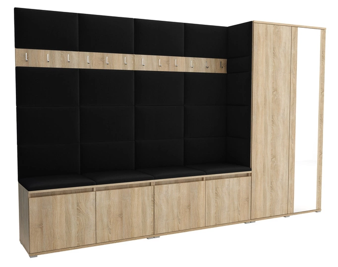 Zestaw składa się z tapicerowanych paneli ściennych, które dodają wnętrzu przytulności i stylu, a także chronią ściany przed zabrudzeniami. Znajdziesz tu rząd solidnych wieszaków, które pomieszczą okrycia wierzchnie całej rodziny, a do tego pojemną szafę z lustrem, która wizualnie powiększa przestrzeń i pozwala szybko sprawdzić swój wygląd przed wyjściem z domu.