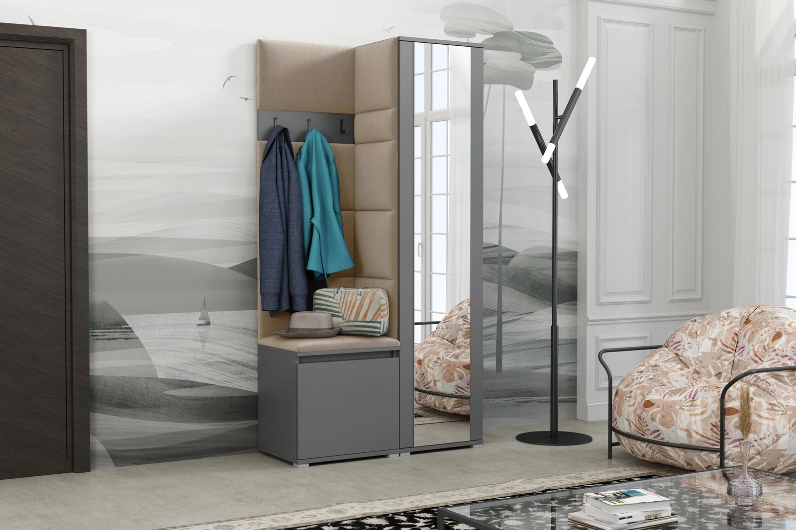 - Kompaktowa garderoba tapicerowana o szerokości 95 cm z lustrem to idealne rozwiązanie do mniejszych przedpokojów. Miękkie panele, praktyczne wieszaki, kufer na obuwie i lustro w jednym – styl, wygoda i funkcjonalność w niewielkiej przestrzeni.