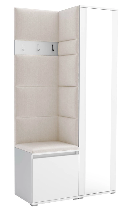 - Kompaktowa garderoba tapicerowana o szerokości 95 cm z lustrem to idealne rozwiązanie do mniejszych przedpokojów. Miękkie panele, praktyczne wieszaki, kufer na obuwie i lustro w jednym – styl, wygoda i funkcjonalność w niewielkiej przestrzeni.