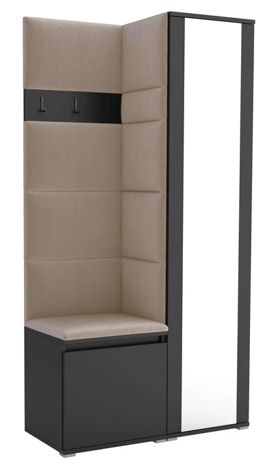 - Kompaktowa garderoba tapicerowana o szerokości 95 cm z lustrem to idealne rozwiązanie do mniejszych przedpokojów. Miękkie panele, praktyczne wieszaki, kufer na obuwie i lustro w jednym – styl, wygoda i funkcjonalność w niewielkiej przestrzeni.
