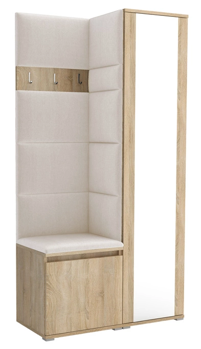 • Kompaktowa garderoba tapicerowana o szerokości 95 cm z lustrem to idealne rozwiązanie do mniejszych przedpokojów. Miękkie panele, praktyczne wieszaki, kufer na obuwie i lustro w jednym – styl, wygoda i funkcjonalność w niewielkiej przestrzeni.
