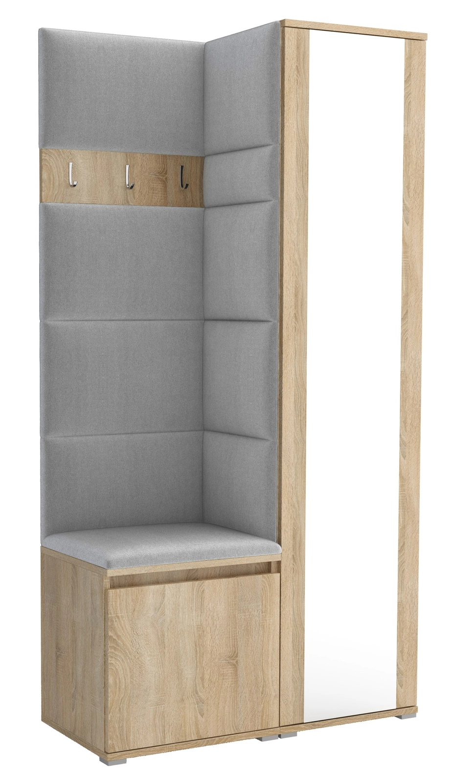 - Kompaktowa garderoba tapicerowana o szerokości 95 cm z lustrem to idealne rozwiązanie do mniejszych przedpokojów. Miękkie panele, praktyczne wieszaki, kufer na obuwie i lustro w jednym – styl, wygoda i funkcjonalność w niewielkiej przestrzeni.
