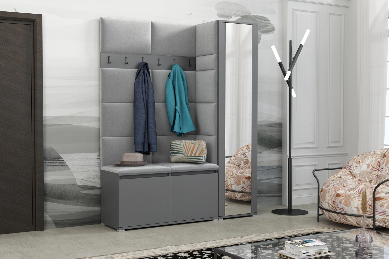 • Garderoba tapicerowana to nowoczesna i funkcjonalna przestrzeń, która łączy design z komfortem. Wykonana z wysokiej jakości materiałów, zapewnia wygodne przechowywanie odzieży i akcesoriów, dodając wnętrzu ciepła i stylu.