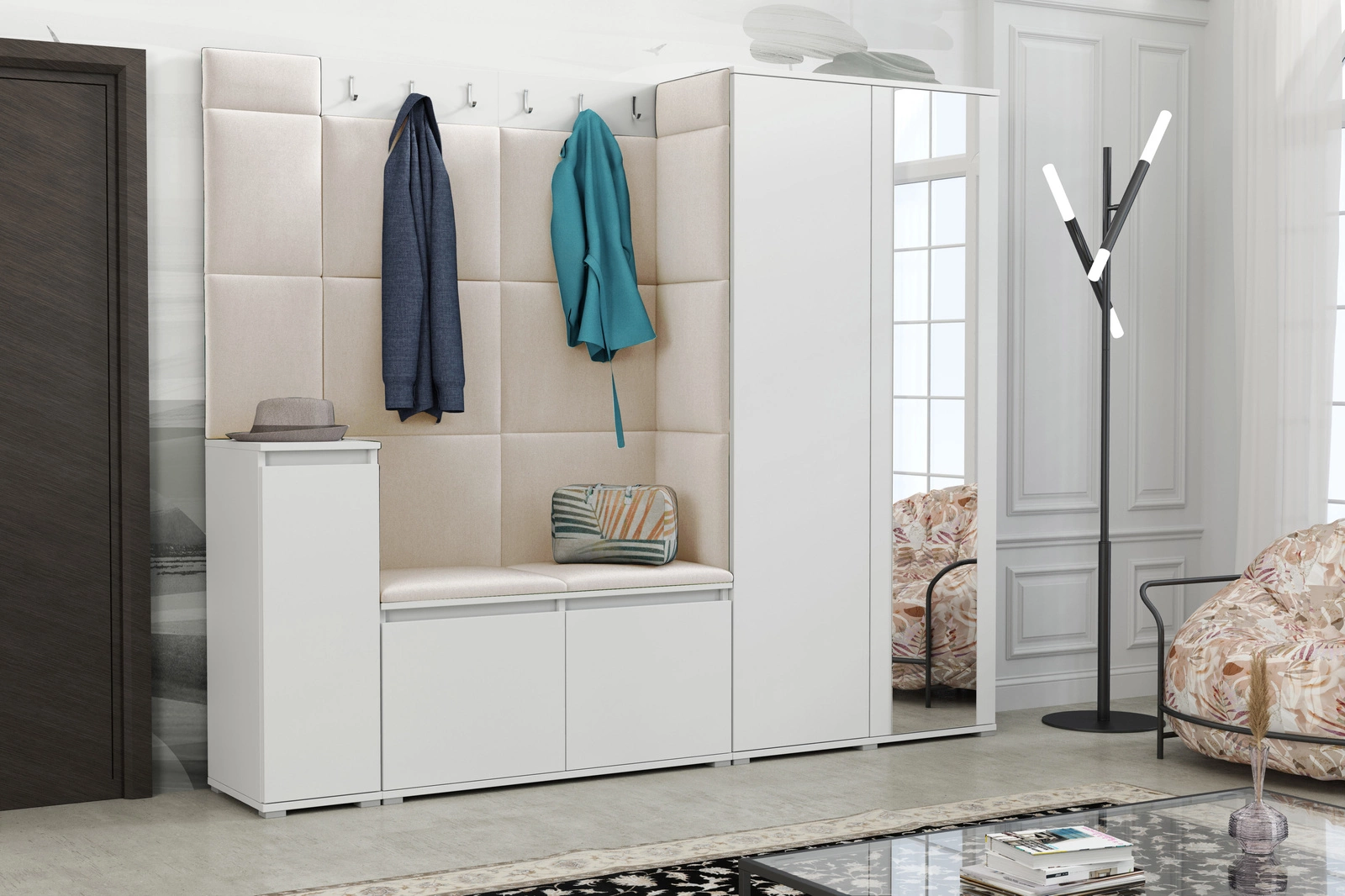 - Odkryj elegancką, tapicerowaną garderobę z dodatkową komodą na buty, która łączy wygodę przechowywania i szyk w jednym. Solidne materiały zapewniają trwałość, a staranne wykonanie – estetykę na najwyższym poziomie.