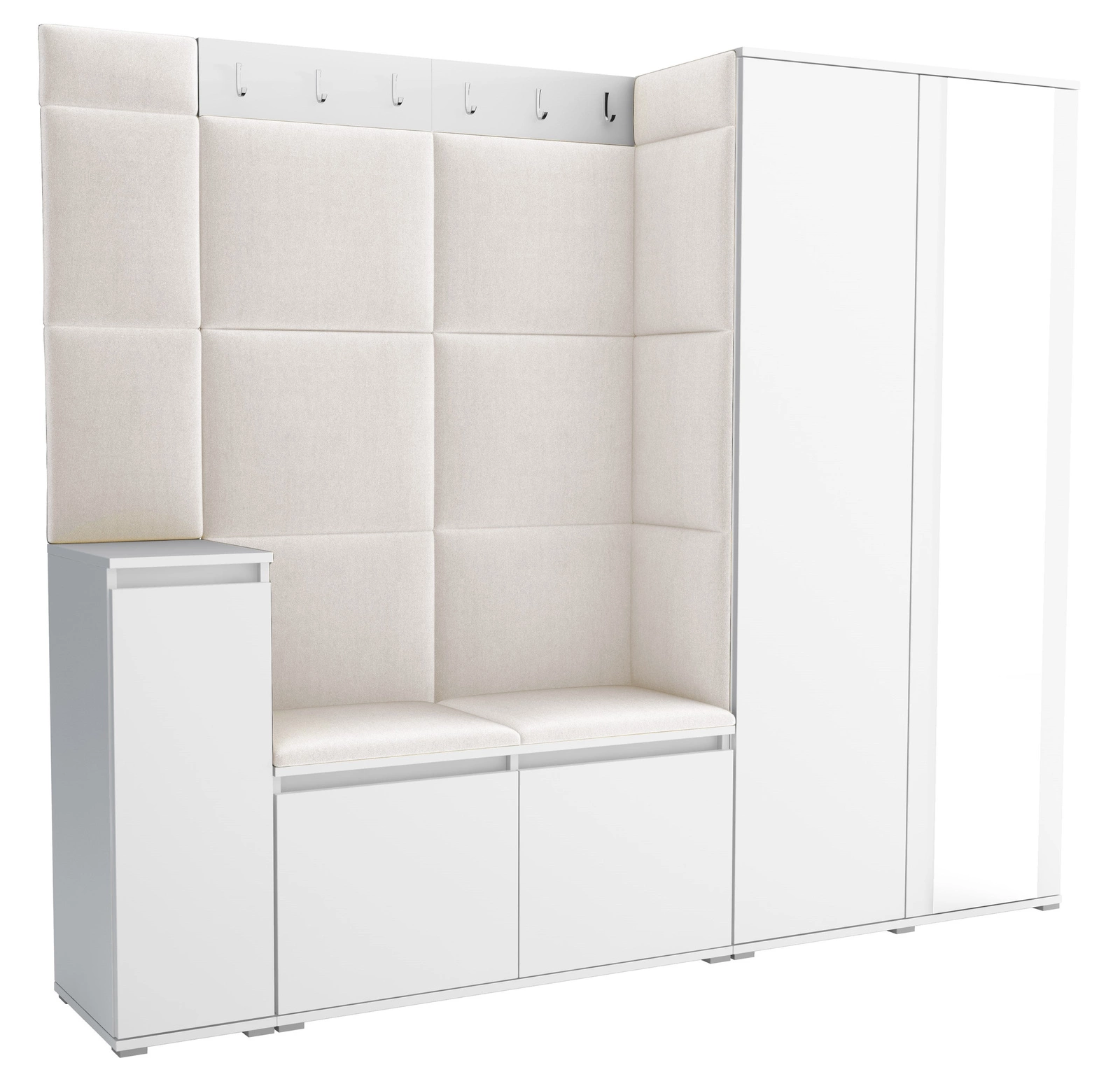 Wygodne siedzisko dzięki miękkiej tapicerce bez trudu zmienisz obuwie czy ułożysz torebkę. Tapicerowane elementy natychmiast ocieplą wnętrze, nadając mu elegancji i zachęcając do dłuższego przebywania w pomieszczeniu. Solidne materiały oraz pianka w panelach zapobiegają przypadkowym zarysowaniom, a jednocześnie gwarantują, że mebel będzie służył Ci przez lata. Dzięki temu zyskujesz nie tylko efektowny element wystroju, lecz także praktyczne i trwałe rozwiązanie do organizacji odzieży i akcesoriów