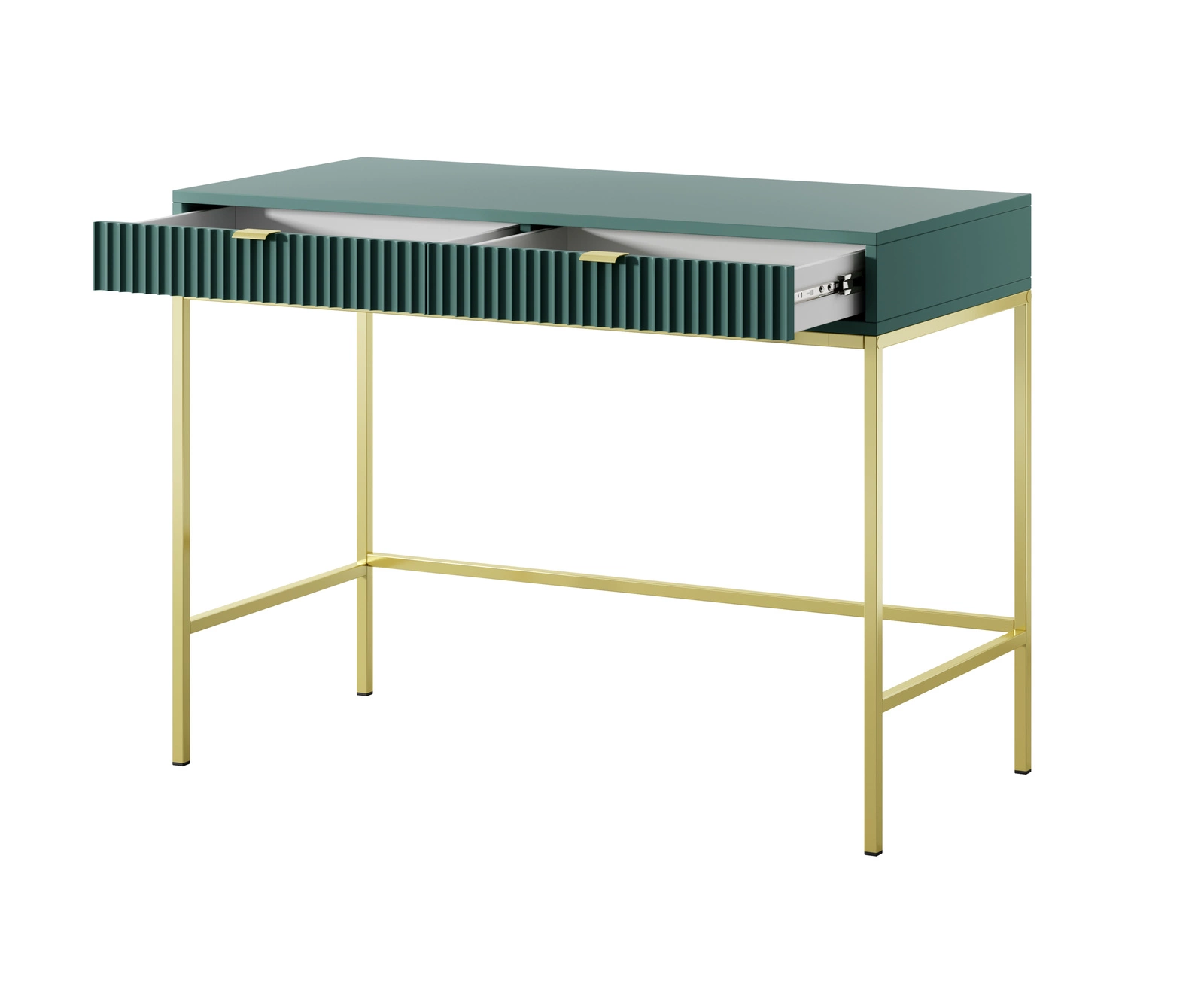- Stylowa toaletka Kioto o długości 104 cm w kolorze zielonym to niezwykły element wystroju wnętrza, który doda wyjątkowego uroku i funkcjonalności Twojej przestrzeni. Wyposażona w dwie szuflady konsola łączy w sobie nowoczesny design z praktycznością.