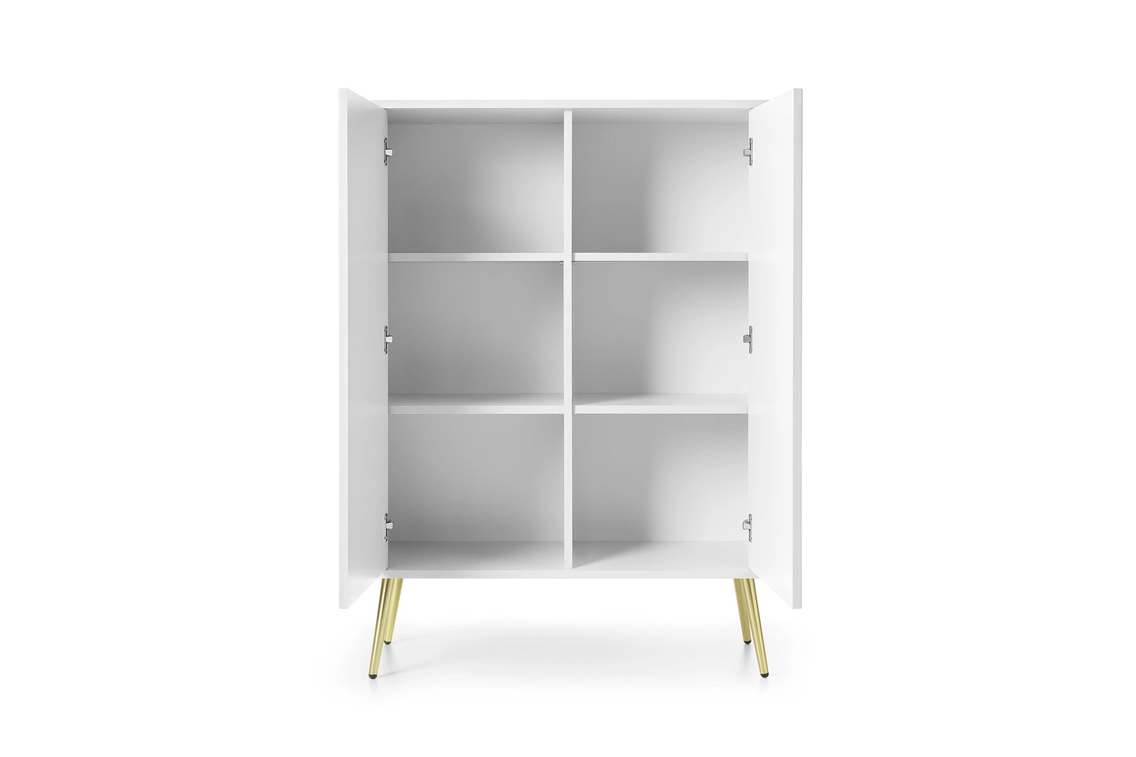 - Wysoka komoda Porto w kolorze białym z frezowanymi frontami i złotymi nóżkami. Elegancka forma, zaokrąglone krawędzie i dwudrzwiowa konstrukcja łączą styl z praktycznością. Idealna do nowoczesnych, luksusowych wnętrz.